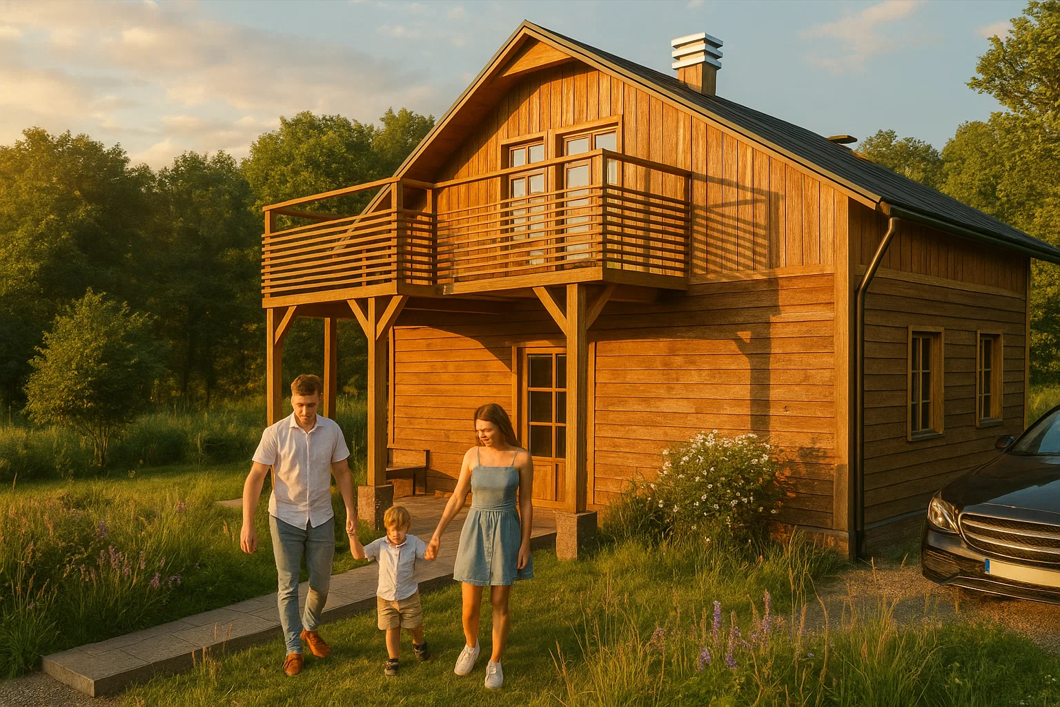 Wykończenie z desek elewacyjnych (do wyboru). Płyta kamienna elewacyjna (różne wzory kamienia), lub 100% bale drewniane. Naturalne lamele elewacyjne. Podświetlane elementy ścian i dachu. Produkt chwilowo niedostępny.