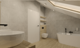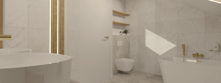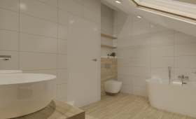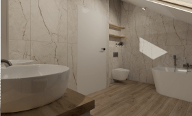 Notatka: Łączna powierzchnia użytkowa obu łazienek: 16,5m2. Wersja L1 (podstawowa) jest wliczona w cenę budynku. Łazienki L2 do L4 są dostępne po darmowej konsultacji z architektem projektu oraz za dopłatą. Ceny dopłat do dodatków, zmiany materiałów, płytek/paneli podłogowych, wykończeń, akcesorii, etc. mogą różnić się w dniu sprzedaży od prezentowanych.
