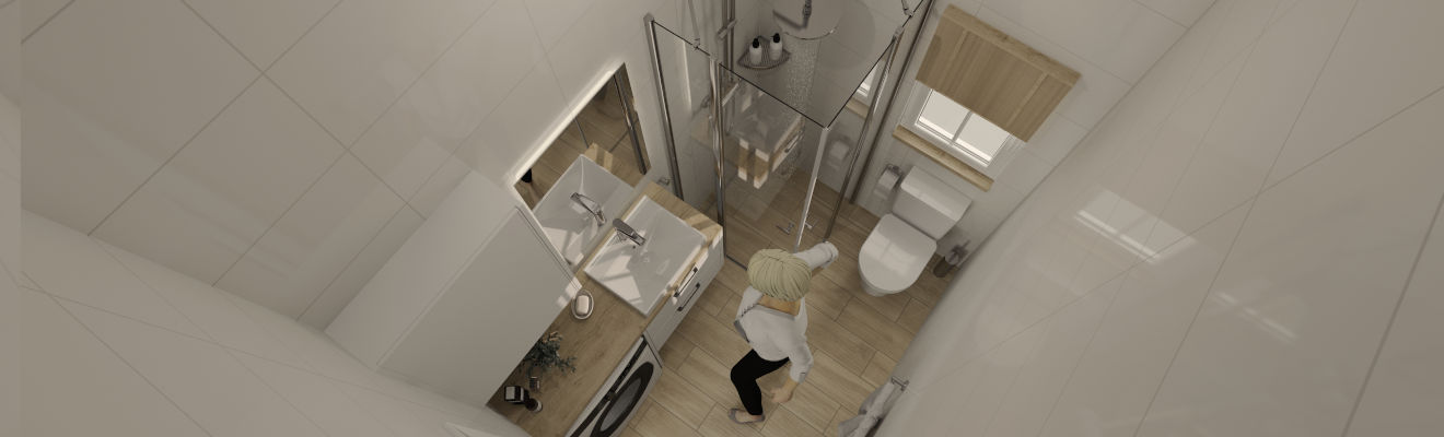 Cztery warianty płytek do wyboru (białe, drewnopodobne, szare, imitujące kamień) sięgające sufitu. Armatura chrom/chrom szczotkowany/czerń. Odpływ liniowy. Podświetlenie LED pod prysznicem. Szafka podumywalkowa z możliwością wyboru umywalki meblowej/nablatowej.