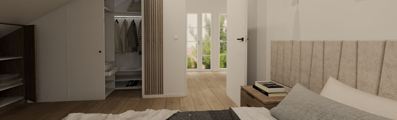 Sypialnie wyposażone są w panele podłogowe imitujące drewno (do wyboru odcień jasny i ciemny), zabudowe meblową we wnęce i pod skosem do wyboru w pięciu wariantach kolorystycznych( biały, kaszmirowy, antracytowy, drewnopodobny jasny, drewnopodobny ciemny).